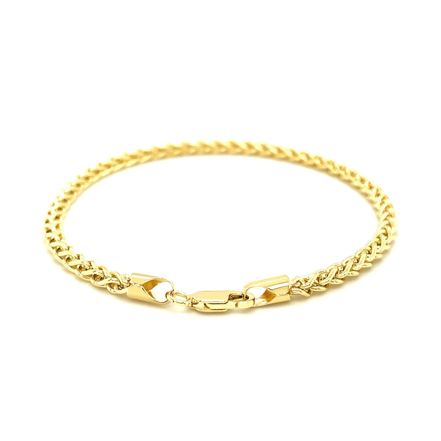 This lightweight wheat chain bracelet comes in 14k yellow gold and has a width of 3.3 millimeters. Secured with a lobster clasp.