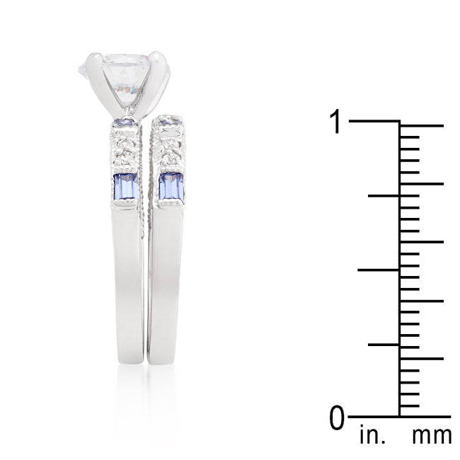 Tanzanite color cubic zirconia stones intermingle with an array of sparkling clears to create a ring set thats delicately enticing. Our genuine rhodium finish is achieved using an electroplating process that coats the item with heavy layers of rhodium a close cousin to platinum which gives our jewelry a platinum luster.