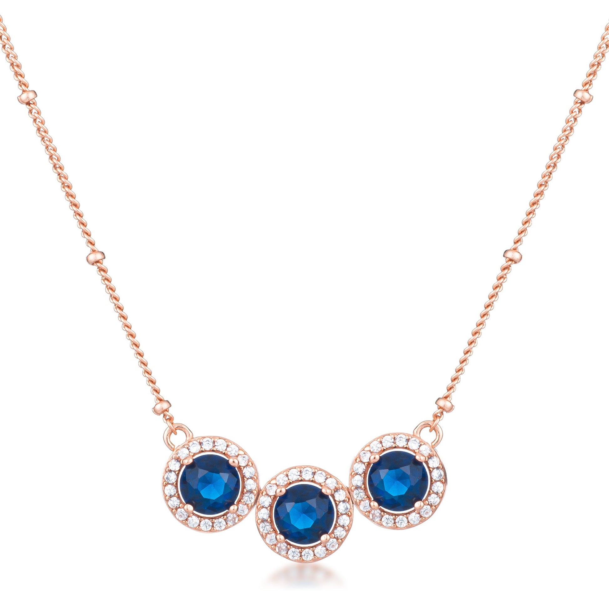 A combination of deep sapphire hues against a feminine Rose Gold plated halo setting melds to create modern day royalty vibes. Highlighting a trio cluster of Sapphire Blue CZ round cut stones sitting at its forefront each stone hugged by a delicate halo of clear CZ stones blends to create a splash of rich ocean against ones collarbones to create the ultimate image of royal class.