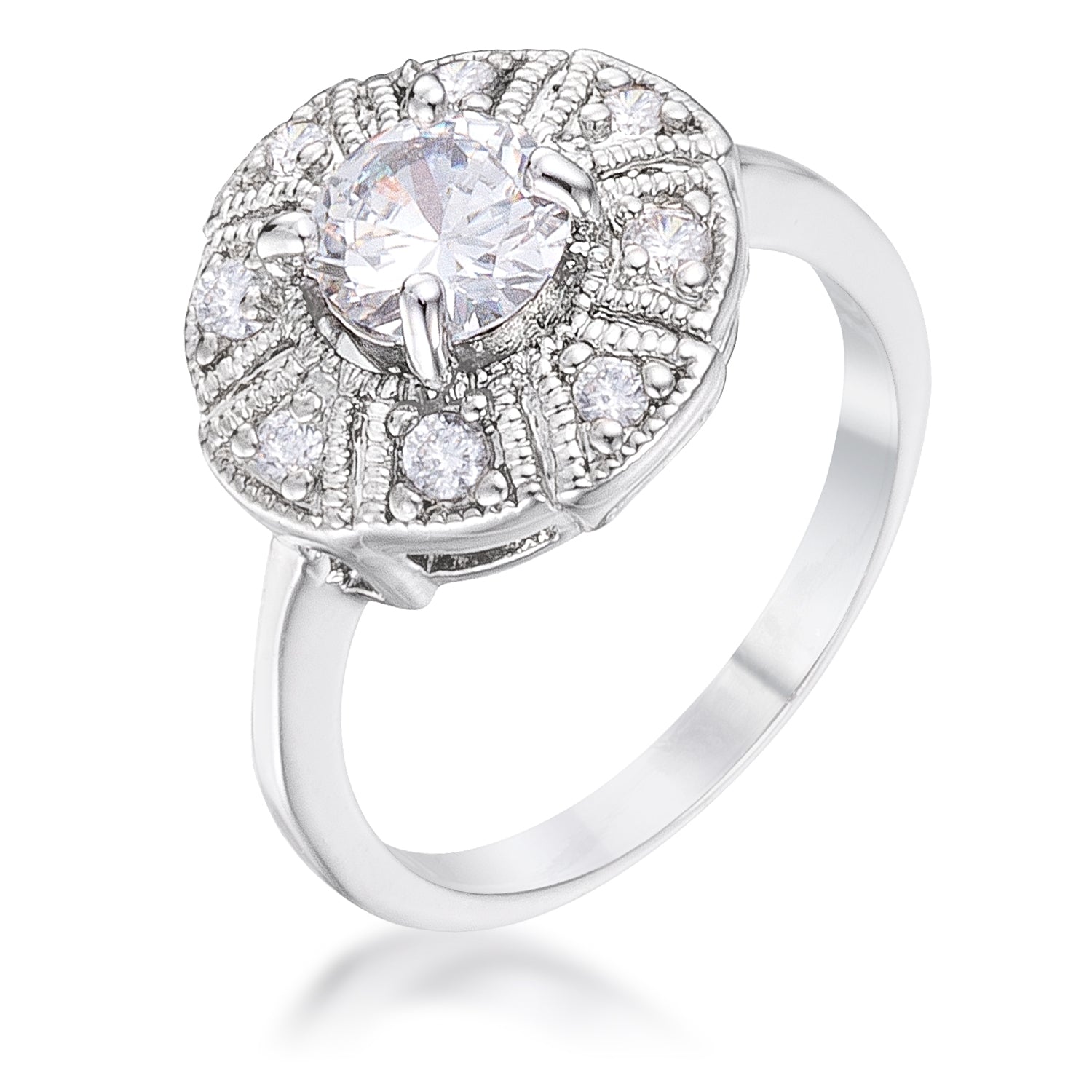 The Queen Mary features a milgrain style antique face with pave cubic zirconia circling a round cubic zircon center in silver tone. Its antique design make it rich with expression and old flavor. Genuine Rhodium Plating is achieved using an electroplating process that coats the item with heavy layers of rhodium a close cousin to platinum which gives this piece a platinum luster.