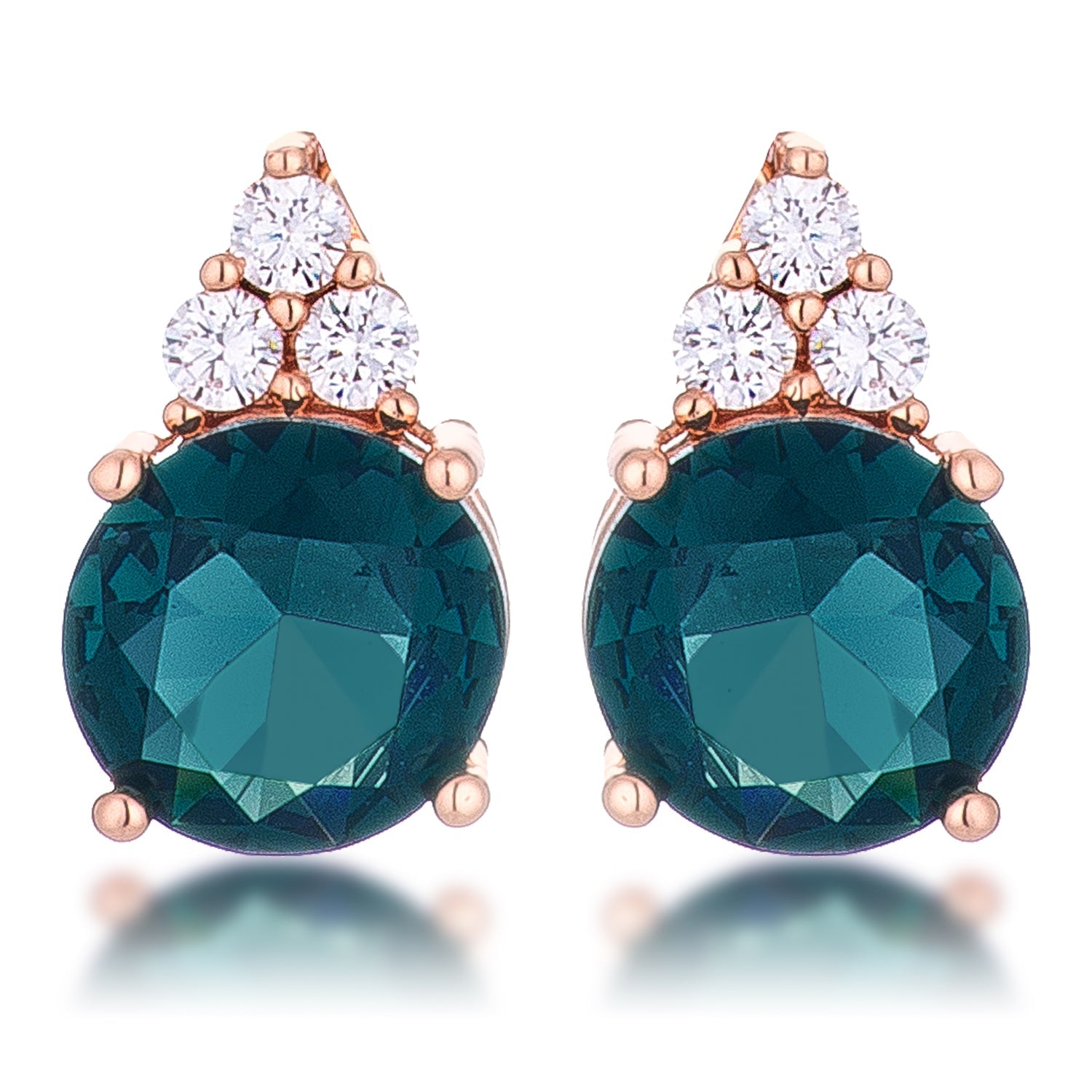 These simple yet elegant earrings feature a mesmerizing blue green stone. A trio of glistening white cubic zirconia rests atop the eye catching round peacock green sparkler. These earrings are bathed in a beautiful rose gold finish for a brilliant shine and is a classic piece you will treasure for a long time.
